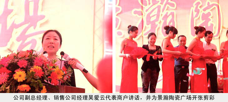 在景瀚陶瓷廣場落成開業慶典儀式上,公司副總吳愛云受王耀董事長委托,代表景德鎮陶瓷股份有限公司,代表紅葉陶瓷1號店,代表所有進駐的業主們發言。她說:今天是五星級陶瓷購物天堂——景瀚陶瓷廣場開業的大好日子,受王耀董事長委托,我僅代表景德鎮陶瓷股份有限公司,代表紅葉陶瓷1號店,代表所有進駐的業主們,對景翰陶瓷廣場的開業表示熱烈的祝賀。祝景瀚陶瓷廣場開業大吉,生意興隆。